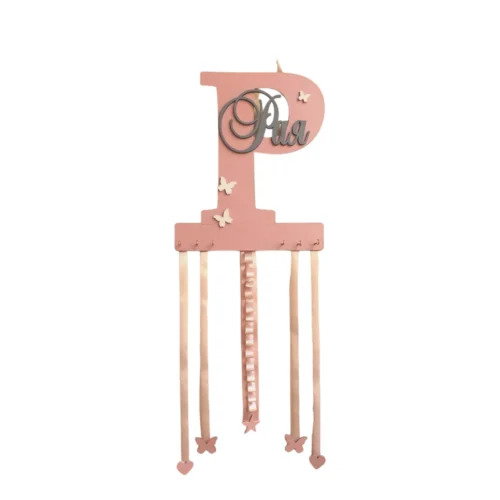 Закачалката за фибички и диадеми( кариочки) е многофункционална и е страхотен подарък за малките принцеси. Дължината на лентите  е 50см.  Размера на буквата е ориентировъчно 20-25см.