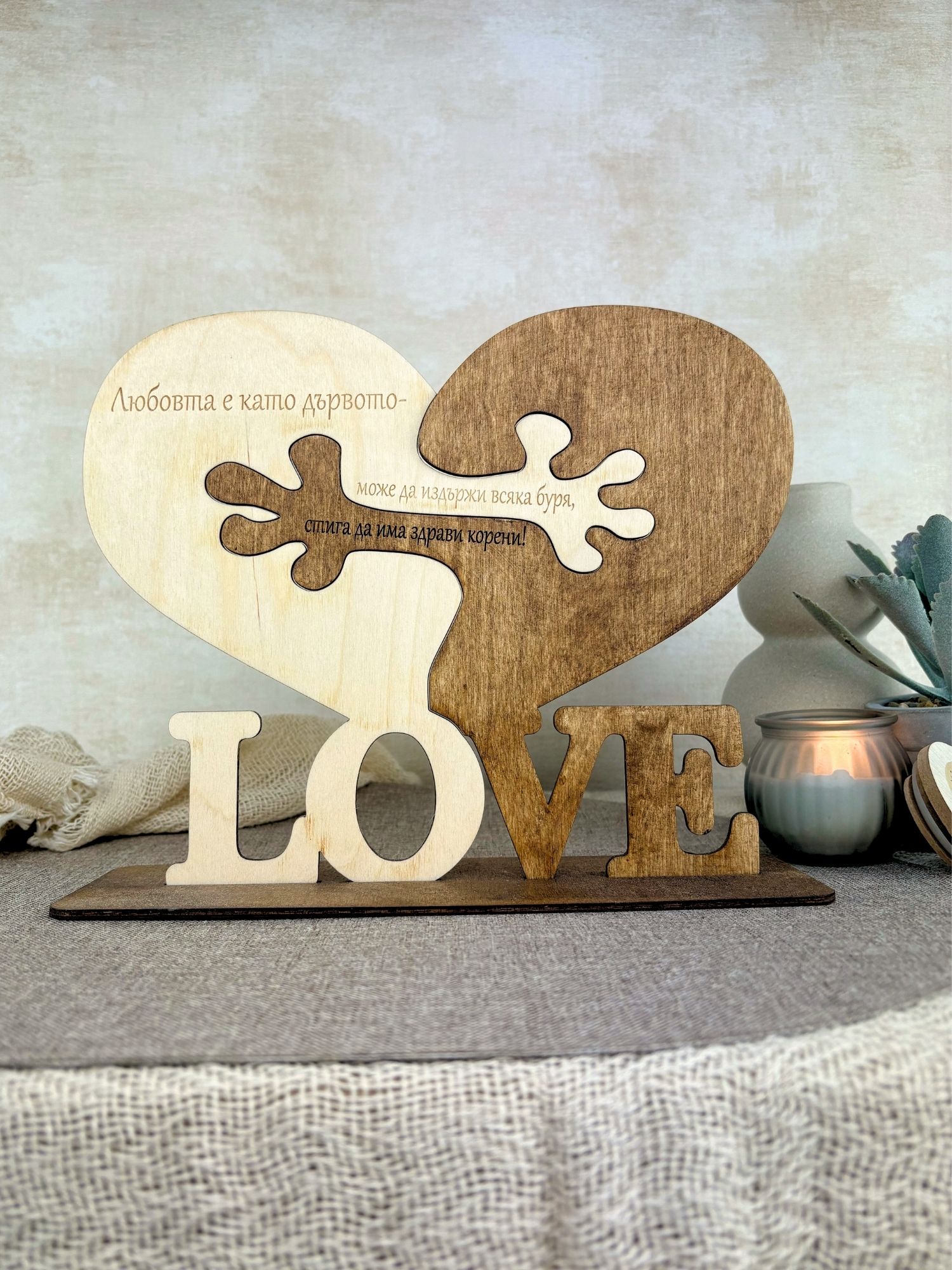 Стилен дървен плакет с форма на сърце и послание за силата на любовта. Дизайнът съчетава два цвята дърво и символиката на корени, които показват, че истинската връзка е здрава и устойчива.