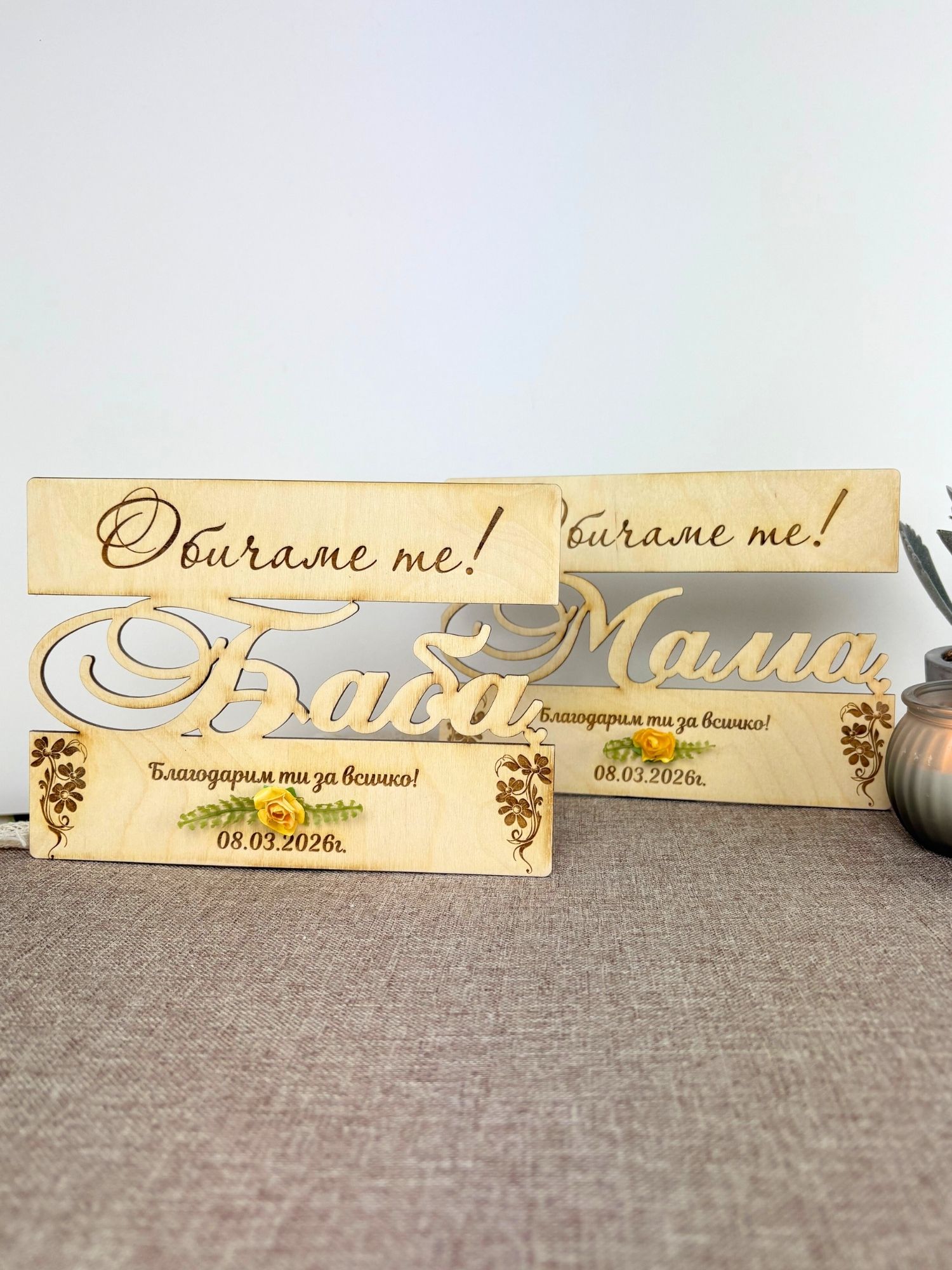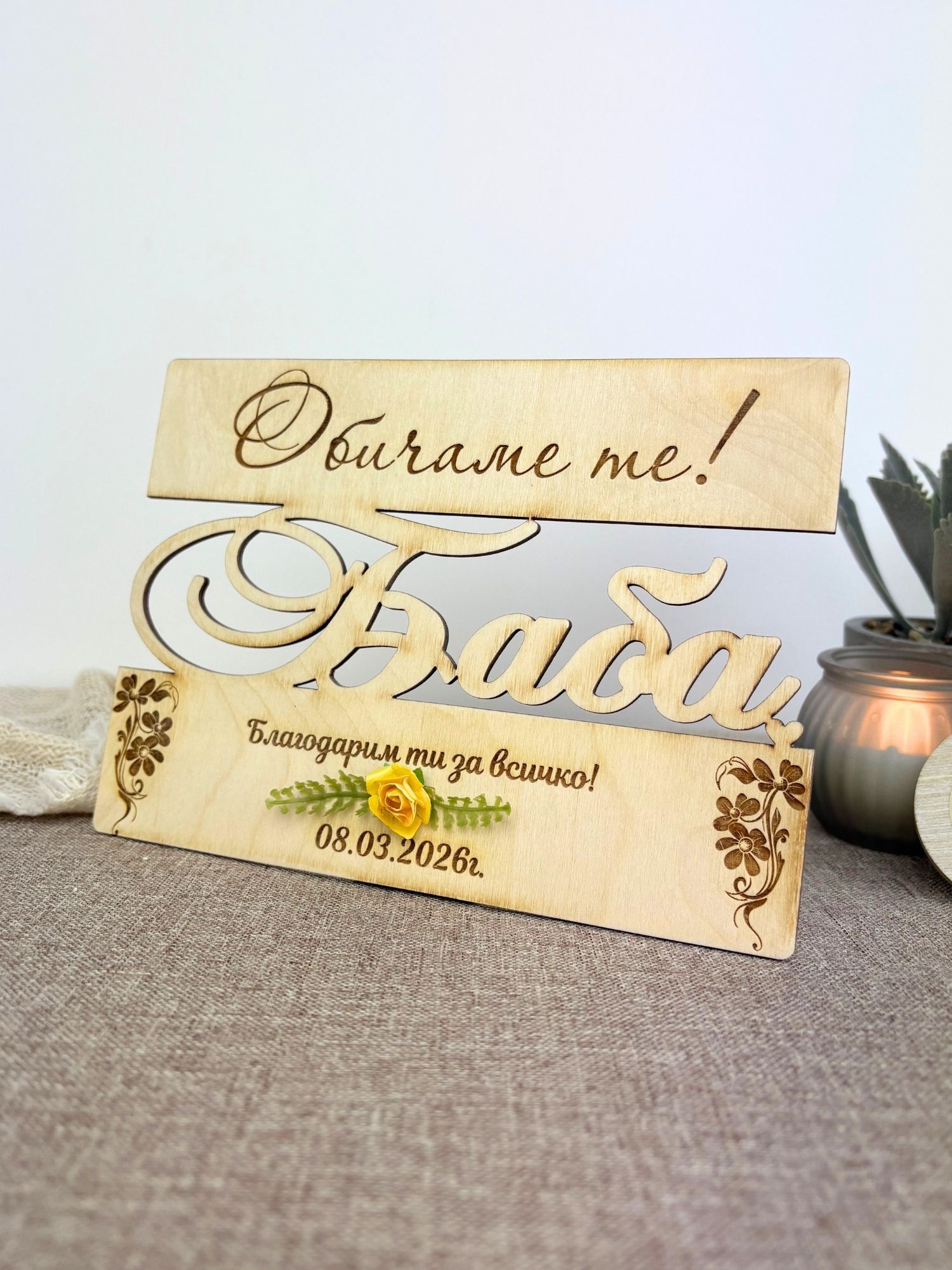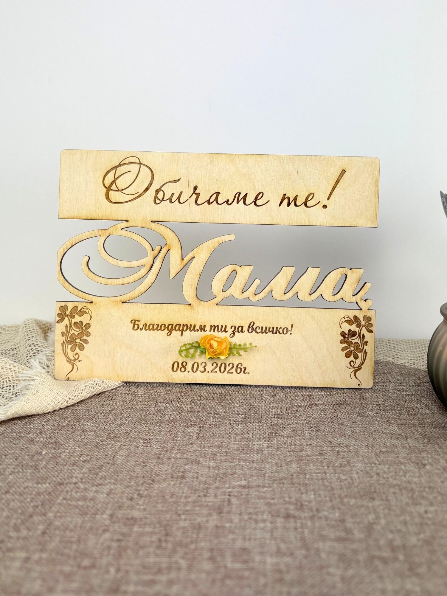 Оригинална дървена картичка с лазерно изрязано име и гравирано послание – стилен и различен начин да зарадвате любим човек за 8 март, рожден ден или друг специален повод.