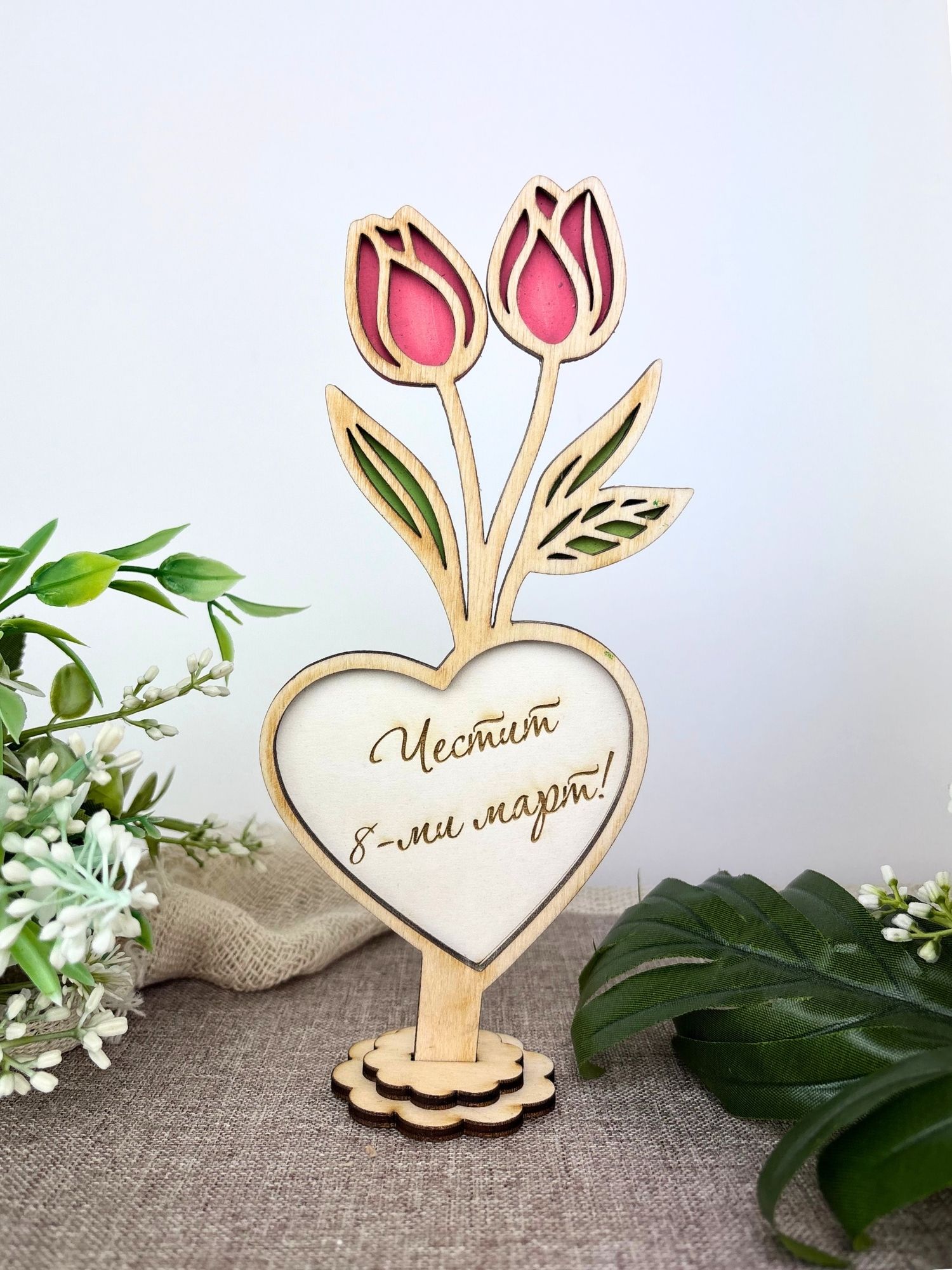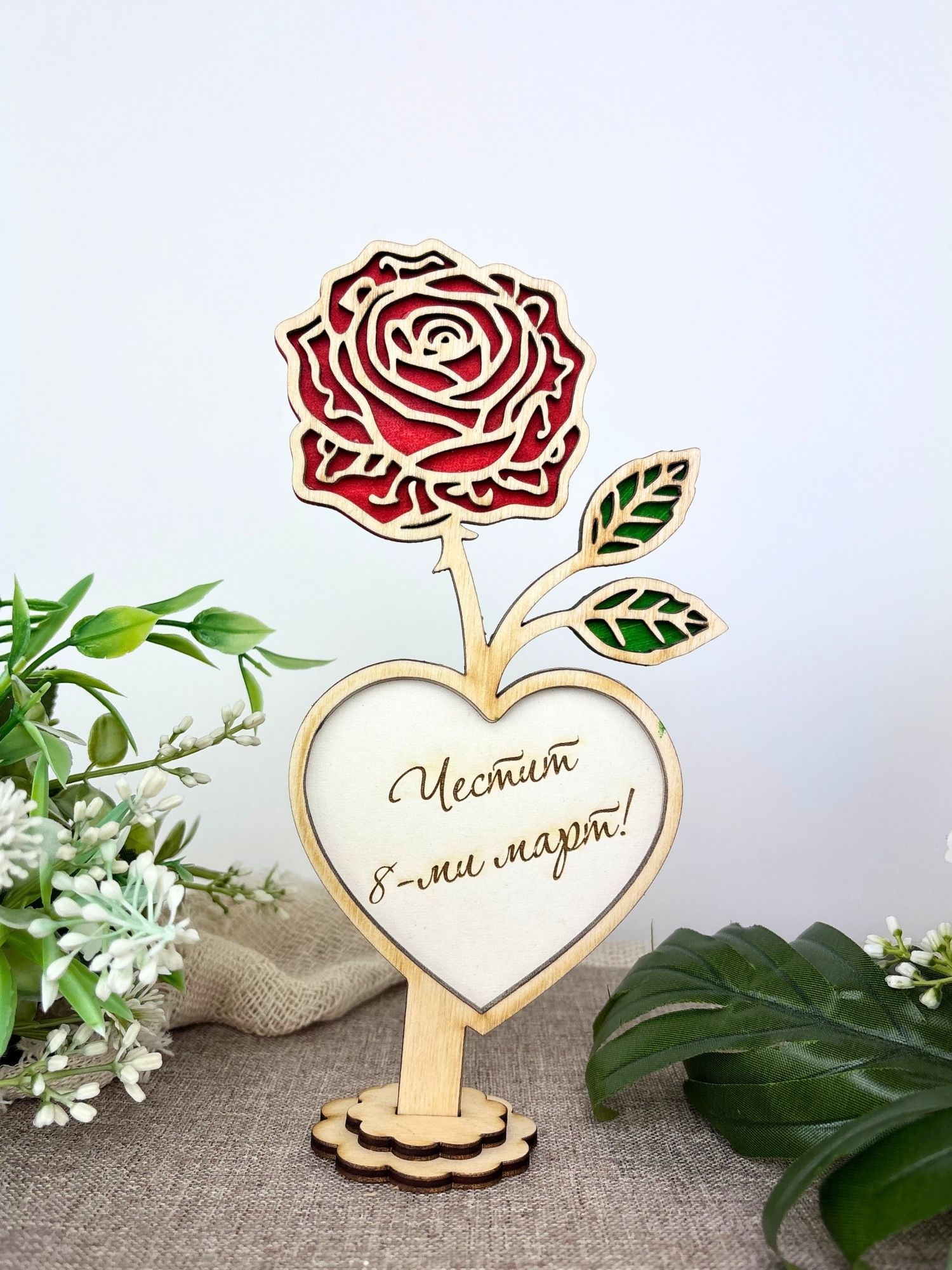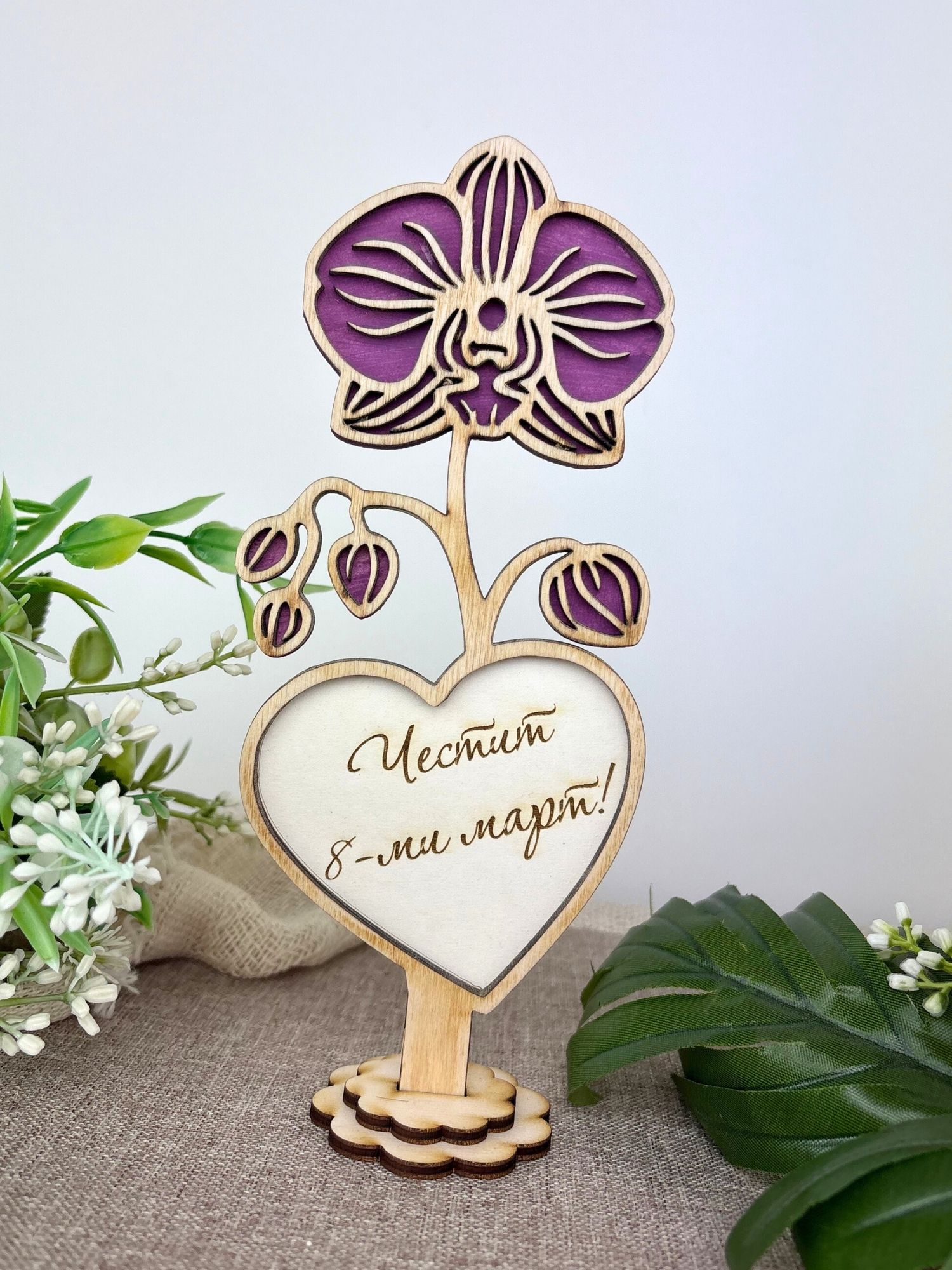 Дървено цвете с гравирано послание „Честит 8-ми март“, подходящо за подарък на мама, баба, учителка или любима жена. Всеки модел е с различен дизайн – орхидея, роза, лалета или лилия – изработени от шврплат с ръчно оцветени акценти за по-ефектна визия.