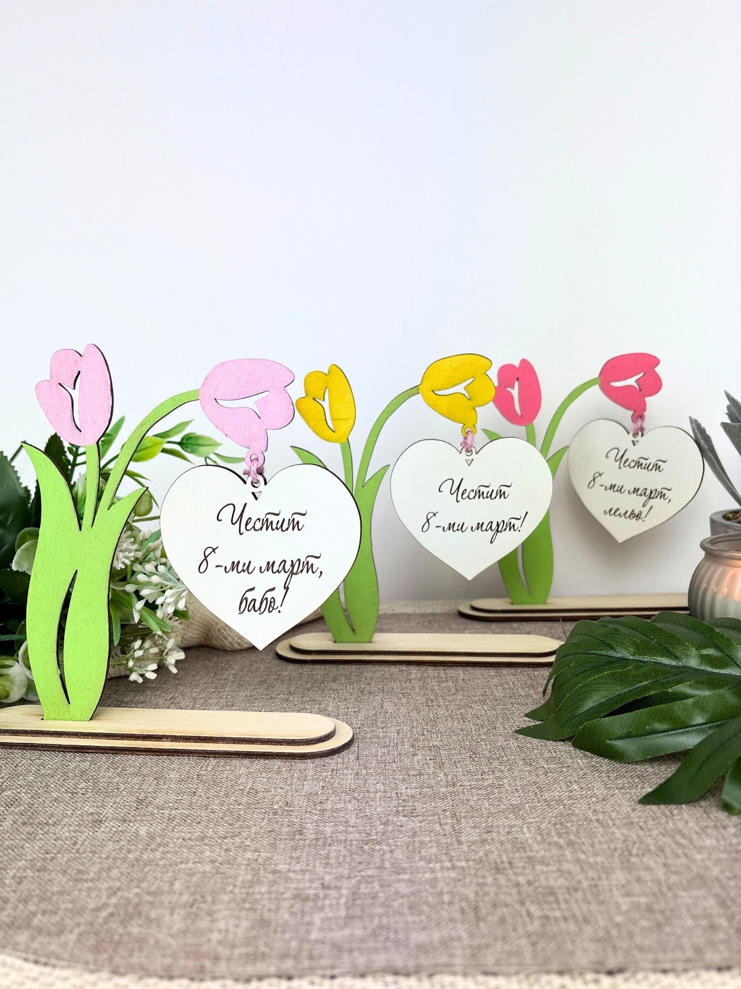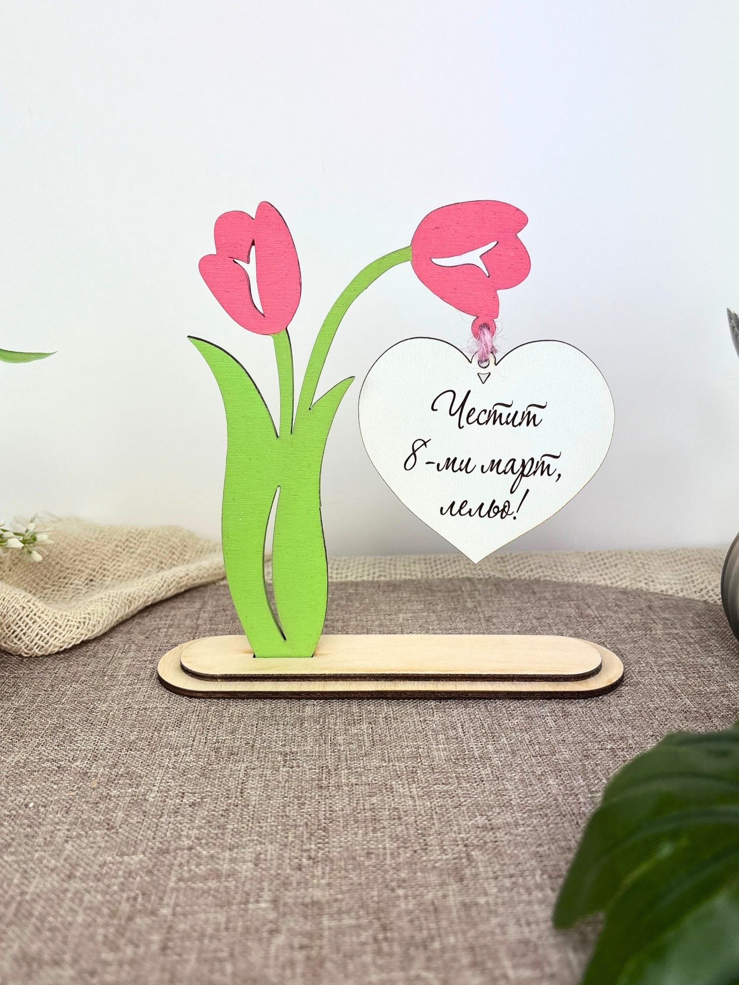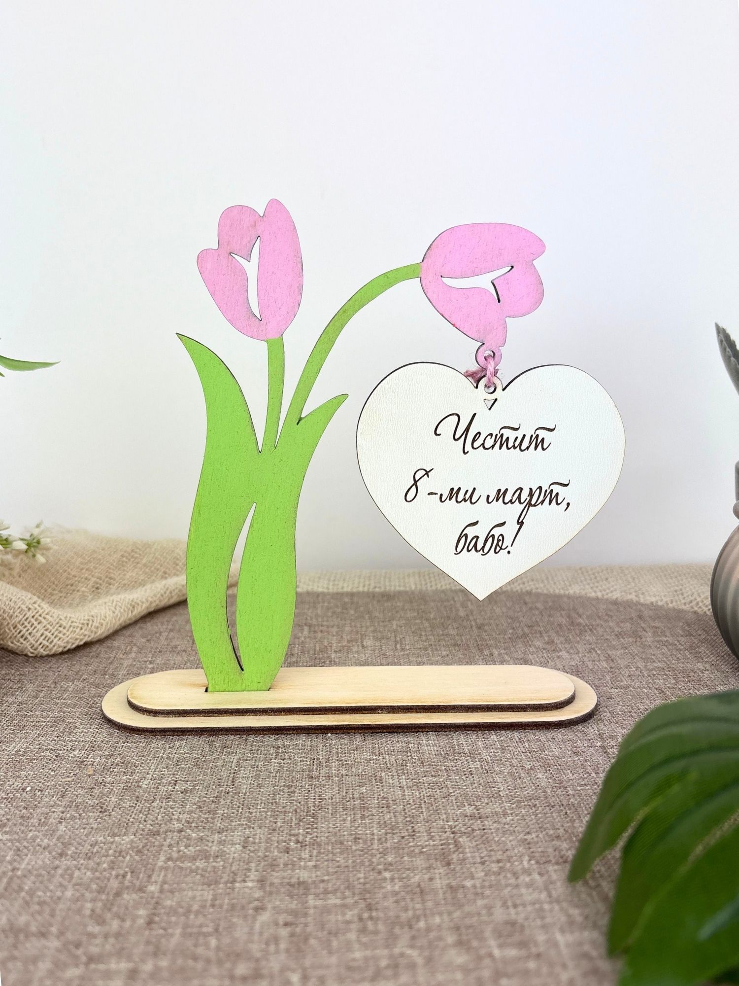 Декоративно дървено лале със сърце и надпис „Честит 8-ми март“, подходящо за баба, мама или любима жена. Изработено от лазерно изрязан и гравиран шперплат, с цветни елементи и стабилна основа за поставяне върху бюро, рафт или маса.