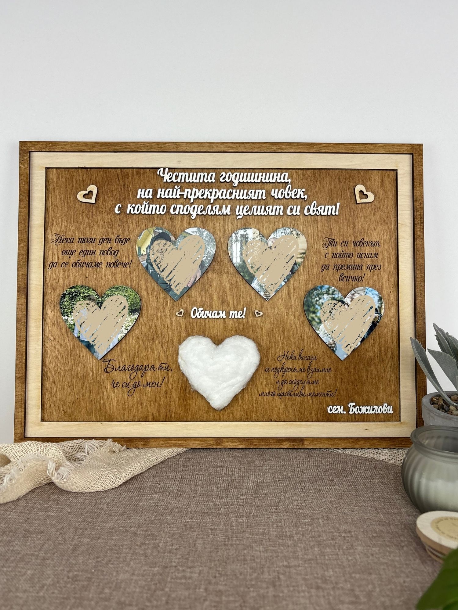 Стилен и сантиментален подарък, създаден да съхрани най-ценните моменти от една връзка. Това дървено пано комбинира снимки, нежни послания и красив дизайн, който го превръща в специален спомен за всяка двойка.
