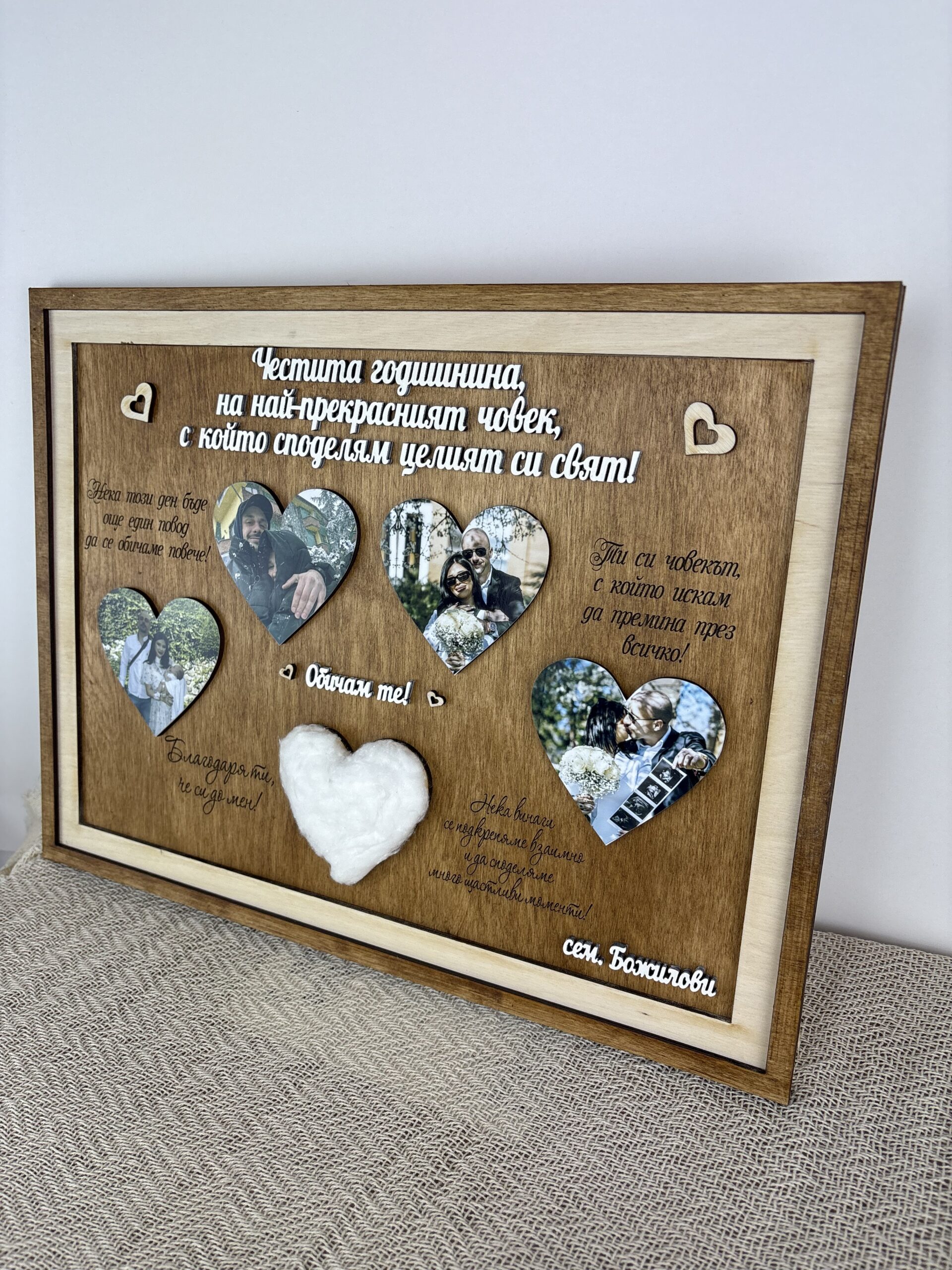 Персонализираното пано със снимки е красив и емоционален подарък за любим човек. То съчетава няколко специални снимки, послание и персонален надпис, които превръщат подаръка в ценен спомен.Паното разполага с няколко места за снимки във формата на сърца, които създават романтична композиция. В центъра е добавен декоративен елемент сърце, който може да се персонализира спрямо вида годишнина.