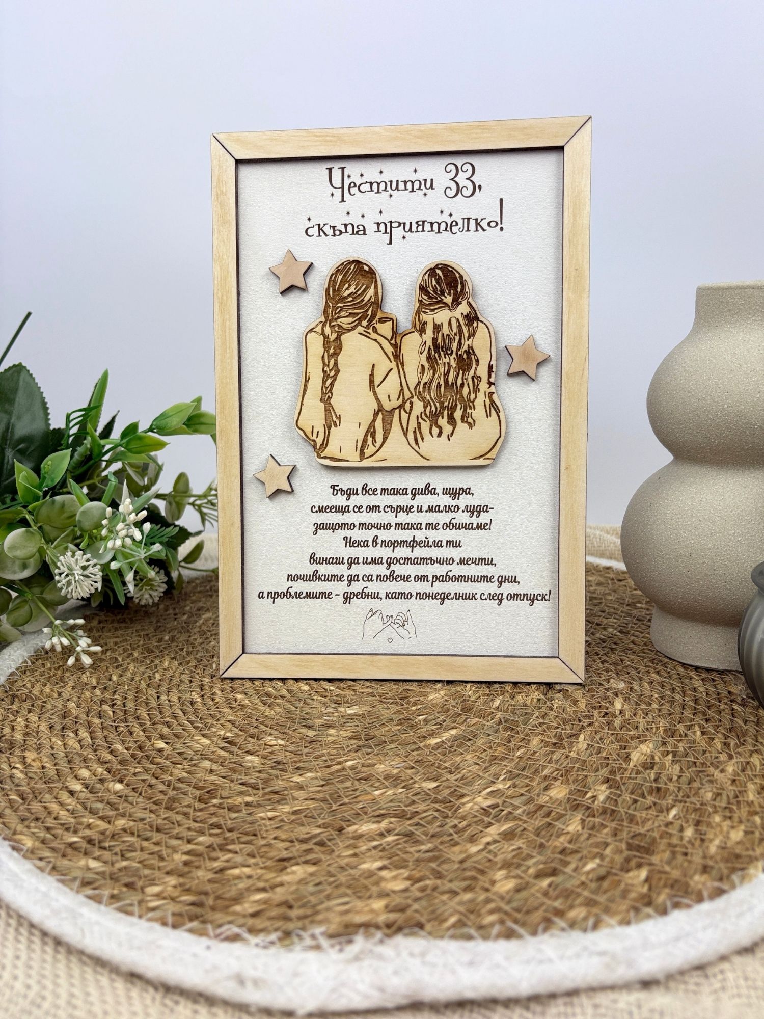 Оригинален и емоционален подарък, който остава като красив спомен за дълго. Този дървен плакет е създаден специално за приятелка и комбинира стилна рамка, фино лазерно изрязана фигура и персонализиран текст с пожелание.